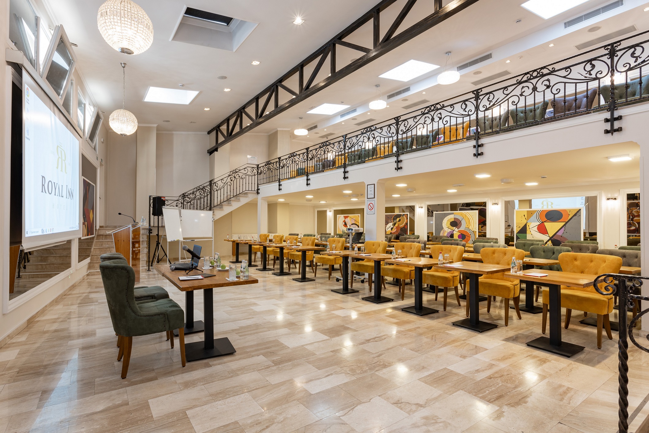 Conference room is provided for events such as business conferences and meetings. Royal Inn hotel offers a conference room with natural light, air conditionig and atrium. Also, the area can be adapted for various happenings. Conference room Royal Inn, with the area size of 150 m2, is located on ground floor and is ideally equipped to accommodate events for maximum 120 persons. It contains all the necessary technical audio/visual equipment. Set up capacity: cocktail 120 persons, cinema 110 persons, classroom 50 persons, U-shape 40 person.